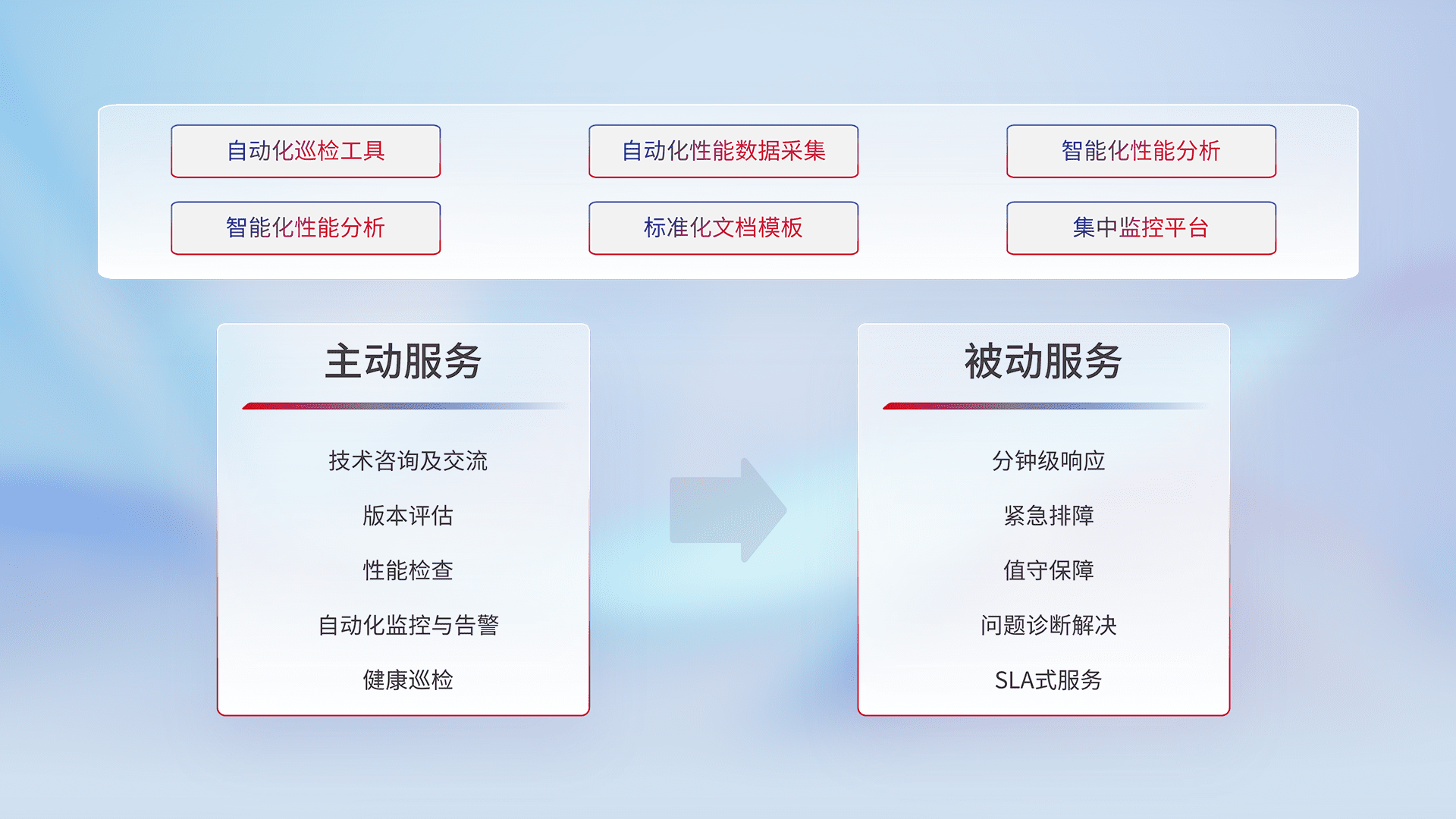 智能化工具和标准化文档,,,保障服务质量,,提供主动服务(包含技术咨询、、、版本评估、、、性能检查、、、、自动化监控与告警、、、、健康巡检)和被动服务包含(分钟级响应、、、紧急排障、、值守保障、、、、问题诊断解决、、、、SLA服务)。。