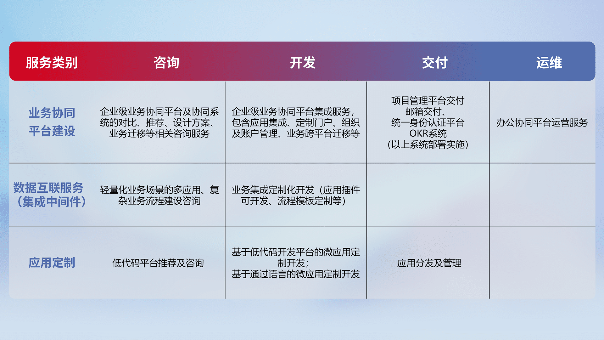 针对钉钉、、企微、、IDaas等平台级产品提供产品的规划、、、、方案、、、、交付、、、定制化开发等服务,,,,实现如统一协同办公、、智能客户服务、、混合会议管理、、智能数据查询、、等业务场景,,,,实现数字化转型。。。